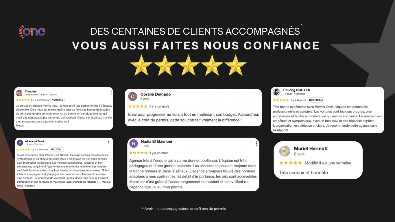 Une équipe sympathique, sérieuse, à l’écoute de l’apprenti et de son accompagnateur. Grâce à Permis One, j’ai pu progresser de manière considérable dans la conduite. Je souligne aussi un bon rapport qualité prix et des « formules/pacs » très interessant.